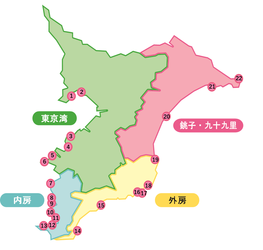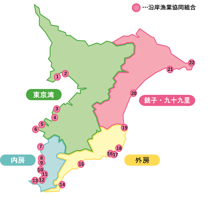 ここでは「東京湾」「内房」「外房」「銚子・九十九里」の各地域に所在する漁業協同組合と営まれている漁業について紹介します。